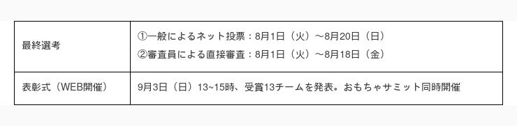 お子さまのいらっしゃるご家庭をはじめ、保育園・幼稚園などの保育現場で働く方、保育士を目指す方、手作りおもちゃに関心をお持ちの方など、全国の皆さまからの投票をお待ちしています。審査結果は、9月4日(月)にホームページに掲載いたします。