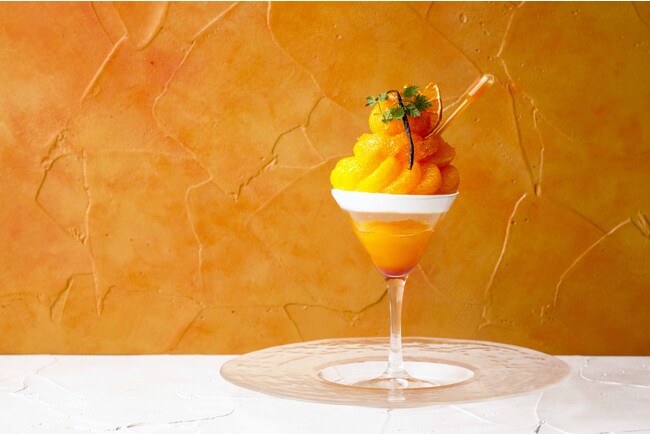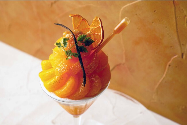 海と山と太陽の恵みを受け、ぎゅっと濃縮した甘味が特徴的な和歌山県産のみかん。みかんの生産量全国一位を誇る、和歌山県内各地のみかんを様々な調理方法で、見た目や風味、口当たりの細部までこだわり抜いたパフェをご用意しました。最上段は紀北エリアの甘味のある温州みかんのコンポートを丸ごと一つ、中段は紀南エリアの酸味あるフレッシュの温州みかんとバニラ風味のコンポート、下段のグラスの有田みかんゼリーはクリームとラズベリーソースで味に変化をつけました。スポイトの有田みかんソースでさらにみかんの酸味や甘味をプラスして、存分にみかんをお楽しみいただけます。ディナー後の〆に夜パフェとしても食べやすいように、最後までさっぱりとした味わいに仕上げました。下からすくって全体のマリアージュをお楽しみください。