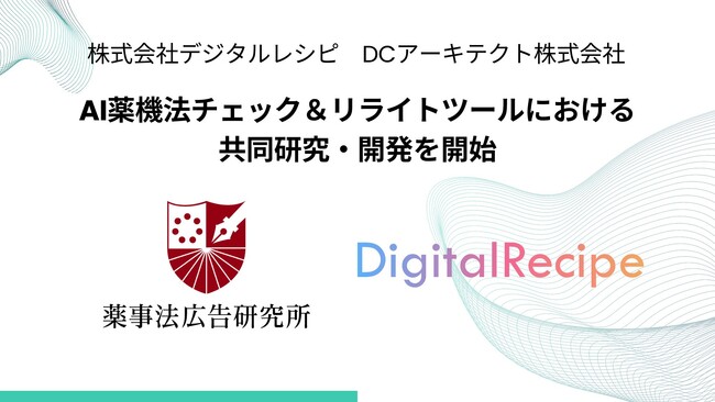 最先端のAI技術を活用した事業創造・AI開発支援に取り組むデジタルレシピと、薬事法広告研究所を運営するDCアーキテクトは共同研究・開発を開始いたします。