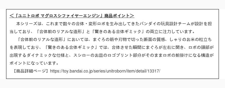 今回スシローがコラボしたバンダイの「ユニトロボーン」は、身のまわりのモノが、“アリエナイ”組み合わせで合体・変形し、ロボになるというコンセプトを持ったシリーズです。今回のスシローとのコラボ商品である「ユニトロボ マグロスシファイヤーエンジン」は、スシローが提供するおすし「まぐろ」と「消防車」を合体させることで、瞬間変形し二足歩行型のロボになるアイテムです。