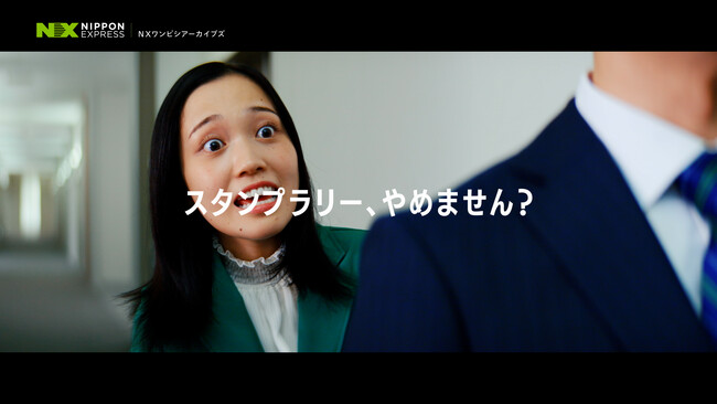 CMに登場する後輩社員の「スタンプラリー、やめません?」のメッセージとともに映る表情とラストの決め台詞が見どころです。また前半の疾走感からのユーモラスな展開にもご注目ください。