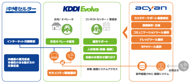 沖縄セルラー電話株式会社(本社:沖縄県那覇市、代表取締役社長:菅隆志、以下 沖縄セルラー)および、株式会社アサイアン(本社:東京都港区、代表取締役社長:丹羽啓晋、以下 アサイアン)ならびに、株式会社KDDIエボルバ(本社:東京都新宿区、代表取締役社長:若槻肇、以下KDDIエボルバ)は、多様化するライフスタイルや、家庭環境によって変容するライフサイクルに合わせた柔軟な働き方を求める求職者が多い地方の雇用推進と、企業の人材確保を目的としたプロジェクトを立ち上げ、2023年4月より沖縄県で開始した『遠隔地在住者の「在宅コールセンター/コンタクトセンター」雇用にかかる通信・セキュリティ・人材育成の課題解消』実証をお知らせいたします。