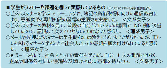 学生はビジネスマナーやeラーニングなどの課題を通して社会人への意識変革が芽生えるという回答がディスコの調査で得られています。
