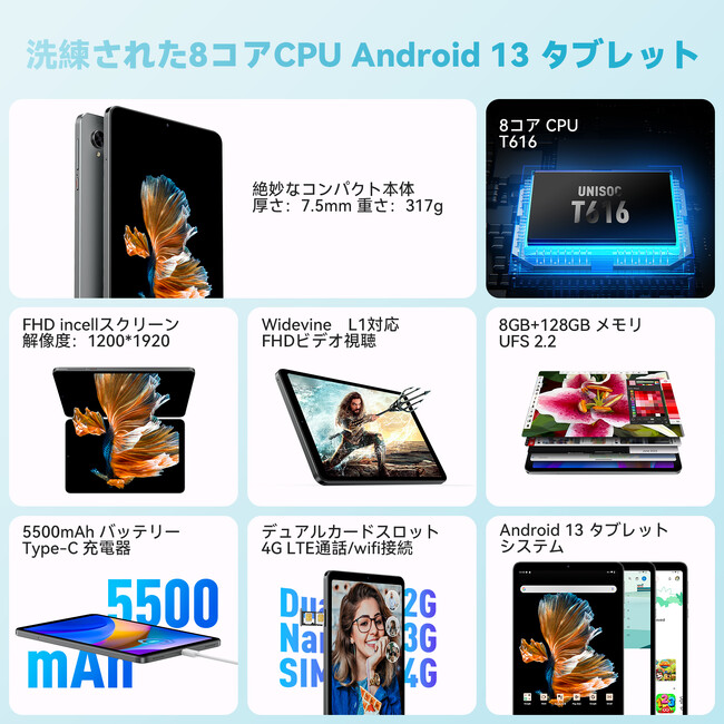 8.4~8.10限定価格15999円:Fpad3 Android13 T616 8コアCPU、8GB+128GB、FHDディスプレイ、Widevine L1対応