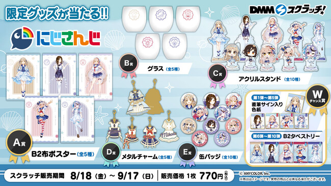 合同会社DMM.com(本社:東京都港区、会長 兼 CEO亀山敬司、https://dmm-corp.com/ 以下DMM )は、ハズレなしのオンラインくじサービス「DMMスクラッチ」にて、2023年8月18日(金)より「にじさんじ スクラッチ第十弾」を販売することをお知らせいたします。本くじでは、DMMスクラッチ限定の多彩なラインナップと共に、ライバーのサイン入り色紙などが抽選で当たるWチャンス賞を計31日間開催いたします。