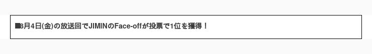 『IDOL CHAMP presents POP-K TOP10 Friday』8月4日(金)の放送回において、JIMINのFace-offが、チャート投票で1位を獲得し、今週のNo.1曲として番組内で放送されました。