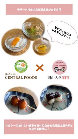 岡山大学では、大学生協と協働でヘルシー日替わりメニューやTFT弁当を提供し、それらの料金のうち20円を開発途上国の給食費として寄付しています。岡山市役所とのコラボメニューは、本学のSDGsアンバサダー公認活動「岡山大学TABLE FOR TWO」部長である増山乃々子さん(経済学部3年)が中心となり企画。岡山市役所と食堂を運営している株式会社セントラルフーズの協力により実現しました。