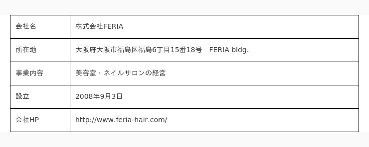 株式会社FERIAは2008年に創立され、大阪府を中心に、美容室7店舗・eyelash3店舗を展開する美容室チェーンです。設立15年のサロン経営のノウハウと大阪を地場として拡大してきた実績を誇ります。