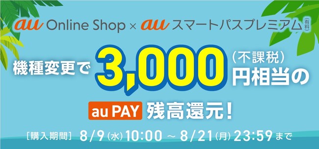 この度、auオンラインショップで対象機種への機種変更と同時にauスマートパスプレミアムへの新規ご加入、もしくは、auスマートパスプレミアム会員が機種変更時に対象クーポンを利用しての機種変更で、3,000円相当のau PAY残高を還元する「au Online Shop×auスマートパスプレミアム スペシャルキャンペーン 2023夏」を2023年8月9日から2023年8月21日まで実施します。