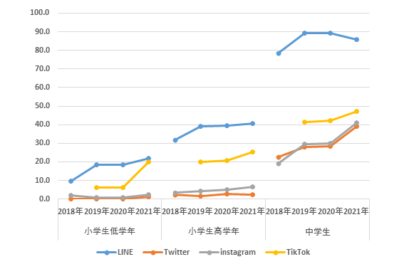 (出典:NTTドコモ モバイル社会研究所, SNSの利用上昇傾向 中学生では9割を超える, https://www.moba-ken.jp/project/children/kodomo20220404.html, 参照2023年8月1日)