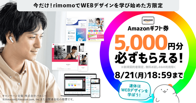 株式会社パルミー(所在地:東京都港区、代表取締役:大野英紀、以下パルミー)は、本日2023年8月9日(水)14時00分から2023年8月21日(月)18時59分までの期間、デザインのスキルが学べるオンライン学習サービス「rimomo(リモモ)」の月額プランを契約するとAmazonギフト券が5,000円分もらえるキャンペーンを開催いたします。
