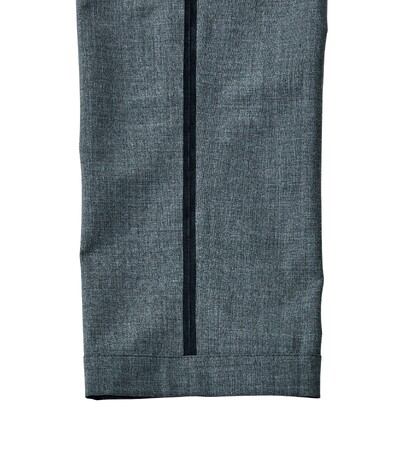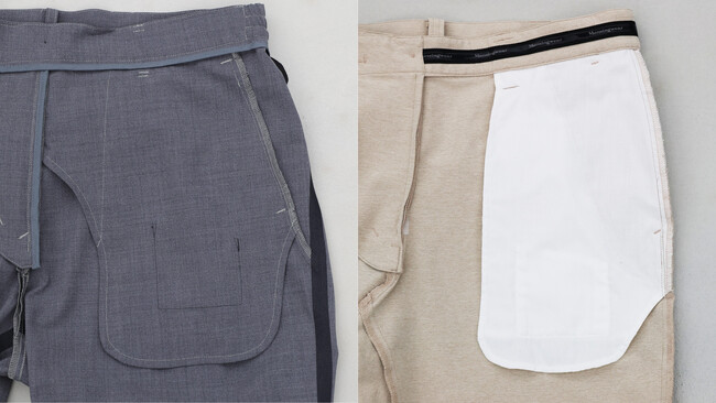 当社のアパレルの研究開発拠点「DISC OSAKA(ディスク オオサカ)」にて、動いた際のポケット口とタックの拡がりを抑えるパターン設計を開発しました。ポケット口を脇線から離し、裏地のポケット袋を前立て部に縫いこむことでポケット口とタックの拡がりを抑え、脇線部の直線的なシルエットの美しさを実現しています。