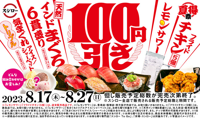 株式会社あきんどスシロー(本社:大阪府吹田市、代表取締役社長:新居 耕平)は、8月17日(木)より、南の鮪の王様と称される、天然のインド鮪の食べ比べができる一皿や、フライドチキン、トリプルアイス/シャーベット、レモンサワーなどを100円引きで、全国のスシローにて期間限定で販売いたします。
