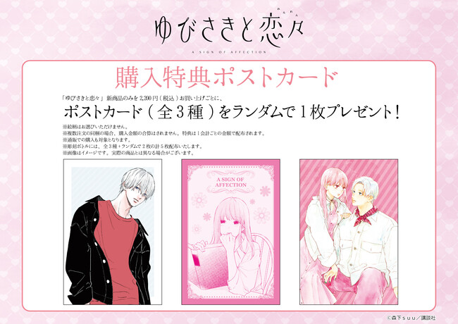 『ゆびさきと恋々』新商品のみを1会計2,200円(税込)お買い上げごとに、購入特典ポストカード(全3種)をランダムで1枚プレゼント。なお、彫刻ボトル購入の場合は全3種+ランダム2枚の計5枚が配布されます。
