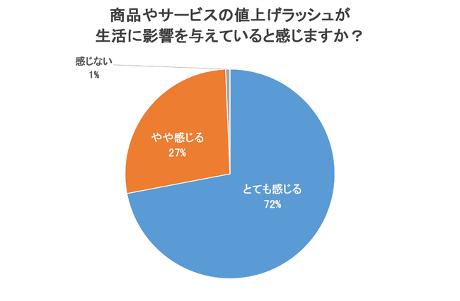 「商品やサービスの値上げラッシュが生活に影響を与えていると感じますか?」という質問では、「とても感じる」が72%、「やや感じる」が27%で、値上げラッシュの生活への影響を感じる人が99%を占める結果になりました。