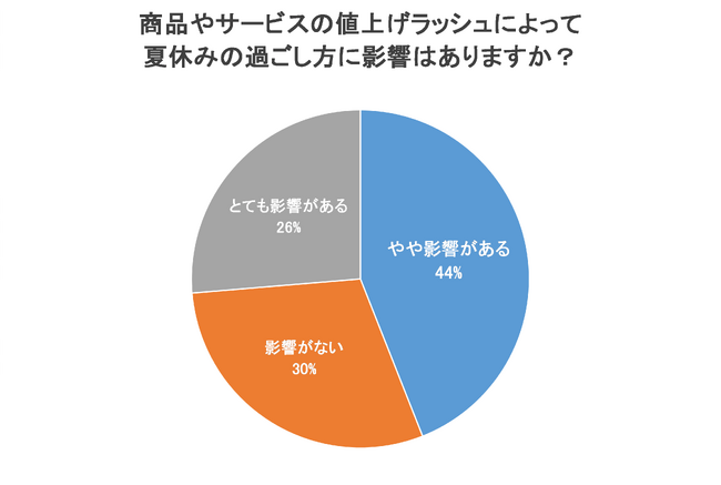 「商品やサービスの値上げラッシュによって夏休みの過ごし方に影響はありますか?」という質問では、「やや影響がある」が44%、「とても影響がある」が26%で、「影響がある」と回答した人が70%を占めました。