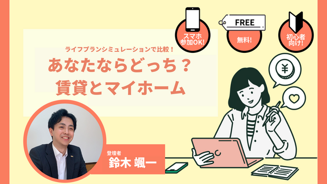 当日は、1人でも多くのお客様を幸せにする為に、お客様目線を徹底し、寄り添ったライフプランを提案している講師の鈴木 颯一様を迎えて「ライフプランシミュレーションで比較!あなたならどっち?賃貸とマイホーム」に関するオンラインセミナーを実施いたしました。