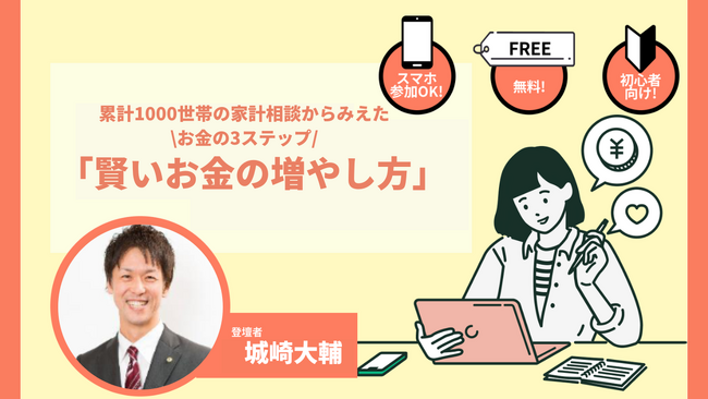当日、「分かりやすく手寧なアドバイス」を心がけ幅広い分野のコンサルティング・マネーセミナーが好評な講師の城崎 大輔様を迎えて「累計1,000世帯の家計相談からみえた¥お金の3ステップ/賢いお金の増やし方」に関するオンラインセミナーを実施いたしました。