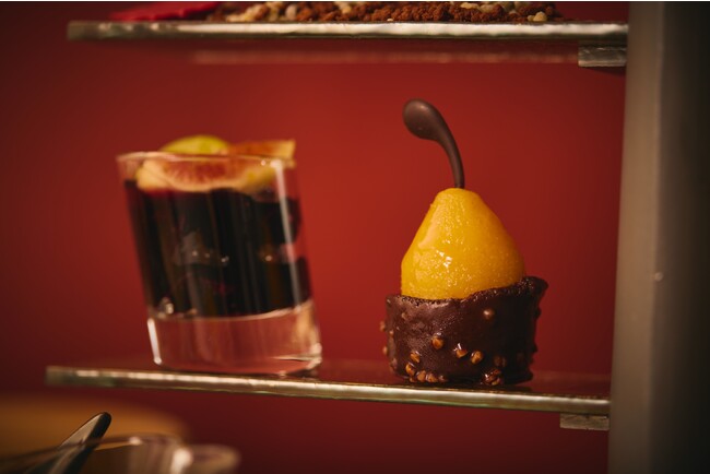 洋ナシはアールグレイシロップに浸しており、香り高い風味とチョコのビターな甘味、そして濃厚な果実の甘味のマリアージュを感じられます。