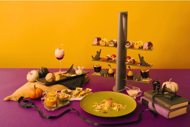 さらに、3種のセイボリーと2種のスコーンもご用意。ドリンクは、京都・和束町産の茶葉を使用した和紅茶をはじめとした、20種類以上のフレーバーティーやカフェラテなどをフリーフローで、甘いスイーツのお供にお楽しみいただけます。また、10月はハロウィン仕様に変更。黒猫やかわいいお化けのスイーツが登場します。