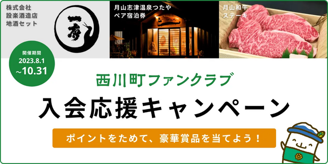 ファンクラブ立ち上げに際し入会応援キャンペーンを実施します。クラブへの入会、宿泊、ふるさと納税、イベントへの参加、買い物など、西川町を応援するアクションを達成して応援ポイントをためることで、西川町にまつわる豪華特典が当たる抽選に応募が可能に。