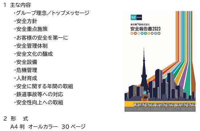 東京地下鉄株式会社(本社:東京都台東区、代表取締役社長:山村 明義、以下「東京メトロ」)は、鉄道事業法に基づき、2022年度に実施した安全の確保に関する取組について、お客様や関係者の方々に広くご理解いただくため、「安全報告書2023」を2023年8月17日(木)に発行します。
