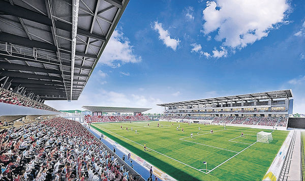 金沢スタジアム(参照:完成イメージ、金沢市提供)は、金沢市磯部町の金沢城北市民運動公園内において金沢市民サッカー場を再整備している施設で、地上4階建て、延べ床面積1万9千平方メートルで、収容人数は約1万人です。来シーズンからJ2・ツエーゲン金沢の本拠地となる予定で、北陸初のJリーグ規格を満たすフットボール専用スタジアムとして来月末に完成後、24年2月ごろの併用開始を目指しています。