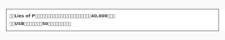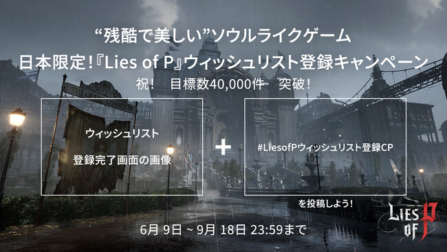 株式会社NEOWIZ (本社:韓国 京畿道城南市、共同代表:金 承徹(キム・スンチョル)/裵 泰根(ベ・テグン)) は『Lies of P』におきまして、日本国内限定で実施中の“『Lies of P』Steamウィッシュリスト登録キャンペーン”について、登録件数が40,000件を突破したことを発表いたしました。