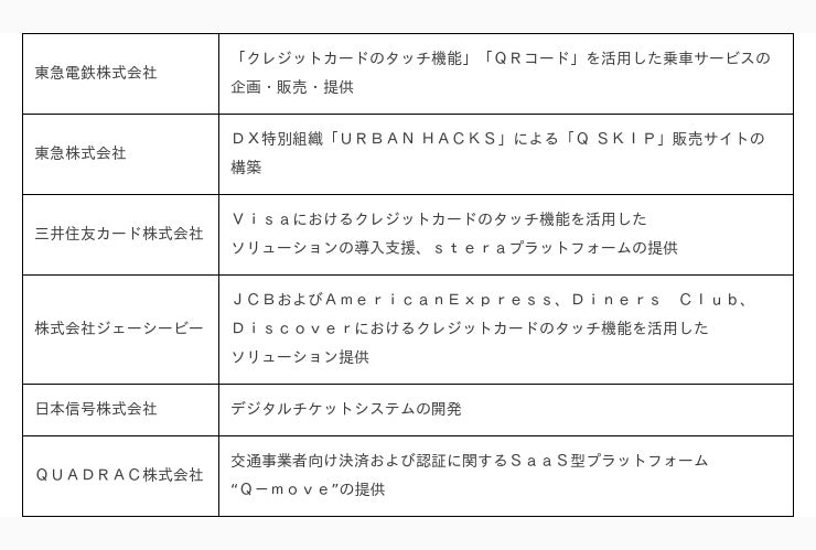 本実証実験においては、連名各社が共創し、「人」「まち」「交通」をデジタルでつなぐ乗車サービスの構築を目指します。既に多くのお客さまにご利用いただいている交通系ICカードを主軸としつつ、東急線沿線にお住いの方だけでなく、インバウンドの回復による訪日外国人を含む来街者の方へも、柔軟でシームレスな乗車を実現するために、タッチ決済に対応したクレジットカードを使用した後払いの乗車サービスについても、2024年春以降の実施に向け検討していきます。
