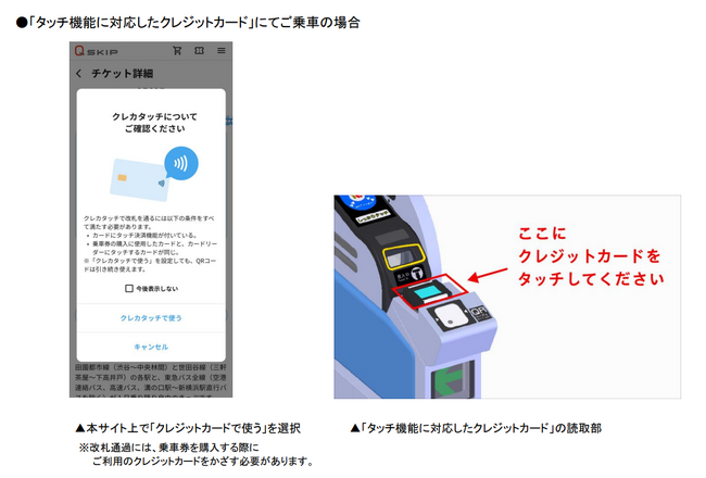 乗車券は、同日にオープンするデジタルチケットサービス「Q SKIP」の販売サイト(以下、本サイト)上でクレジットカードを使用して乗車前にご購入いただきます。入出場時は、「タッチ機能に対応したクレジットカード」または「スマートフォンなどに表示されるQRコード」を対象改札機の読取部にかざすことで、券売機や窓口を介さずスムーズにご利用いただけます。タッチ機能に対応したクレジットカードを使用した改札機の通過サービスは、三井住友カードの提供する公共交通向けソリューション「stera transit(ステラトランジット)」を導入することで実現します。