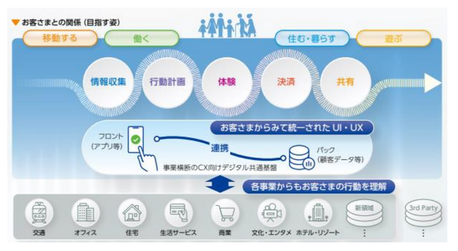 お客さまとの関係で目指す姿は、お客さまからみて統一されたUI・UXが整備され、また、各事業の顧客データやトランザクションデータが連携するデジタル共通基盤を介して、事業ごとではなく「行動ベース」でお客さまをより深く理解していくことです。これにより、日常生活での行動シーンにおいて、リアルと一貫した、シームレスなサービス提供を可能とし、お客さまの体験価値を高めます。