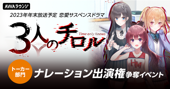 AWA株式会社(本社:東京都港区、代表取締役CEO:冨樫晃己)が運営する、サブスクリプション型(定額制)音楽ストリーミングサービス「AWA(アワ)」は、2023年年末に地上波で放送予定の恋愛サスペンスドラマ『3人のチロル』内でのナレーション出演を賭けたイベントエントリーを開始いたしました。また、『3人のチロル』オープニングテーマ歌唱&オリジナルMV制作権争奪イベントのエントリーも同時募集中です。