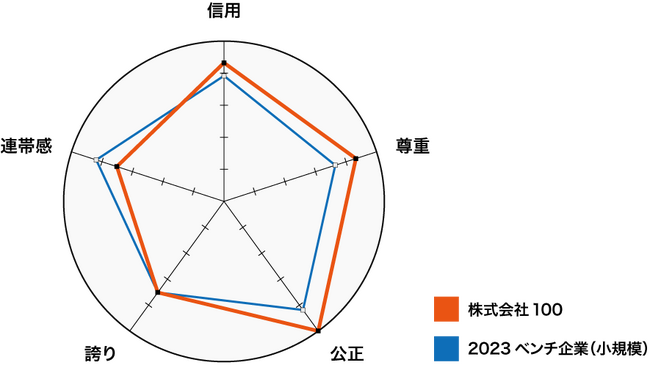 特に信頼においては、従業員とマネジメントとの間にある高いレベルの「信頼」のことを指し、リーダーへの「信用」、従業員の「尊重」や「公正」な扱い、そして仕事への「誇り」と仲間への「連帯感」からなります。100の「信頼」は、以下のような結果となりました。