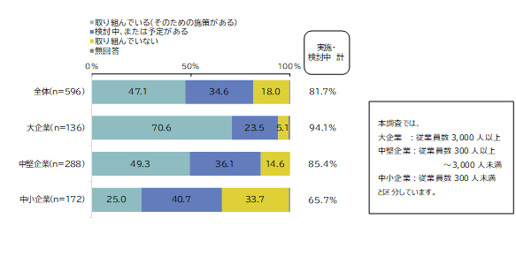 ○従業員規模別でみると、大企業は、既に取り組みを行っている企業が26.5%と、全体と比較して約10ポイント高く、検討中(36.3%)も含めると62.8%の企業が取り組みを実施・検討していました。