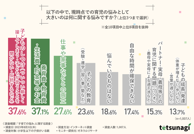 そこで今回、うれしいことや悩みをシェアし合える『てつなぎ』(https://tetsunagi-p.com)を運営する株式会社コミットグロースは、小学生以下の子供がいる親を対象に、「子育ての悩み」に関する調査を実施しました。