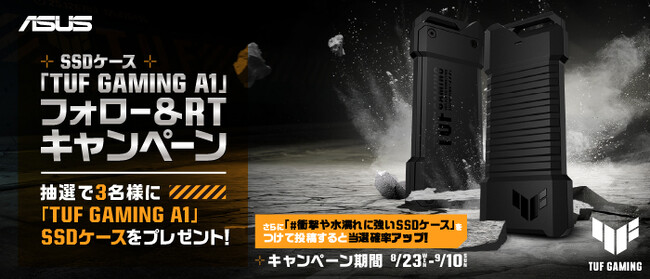 ASUS JAPAN株式会社は、ASUS公式X(Twitter)をフォローしてキャンペーン投稿をリツイートするだけで参加可能の「SSDケース 「TUF GAMING A1」 フォロー&RTキャンペーン」の開催を発表しました。