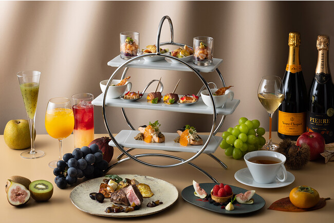 シャンパンや紅茶と相性が良い“梨”や“林檎”、“柿”など秋のフルーツを中心に、華やかなセイボリーやデザートをお楽しみいただける今秋のイブニングハイティー。スタンドには、和梨と赤海老を鮪と秋野菜のタルタルと合わせた一品をはじめ、バラと林檎のコンフィチュールを添えたフォアグラと紅玉のテリーヌなど前菜5品と、旬を迎える秋鮭をグリルし、みかんの酸味がきいたグリビッシュソースを掛けた魚料理などをご用意。メインディッシュのアンガスビーフのポワレには、葡萄の甘酸っぱさが肉の旨味を引き立てるフルーティーなソースを合わせました。フリーフローのドリンクには、爽やかな味わいのシャンパン「ヴーヴ・クリコ」をはじめ、フルーツリキュールで作る7種のオリジナルカクテル、ノンアルコールのスパークリングワイン、モクテル、アメリカの紅茶ブランド「Mighty(マイティー) Leaf(リーフ)」の紅茶10種と充実した内容をご提供いたします。