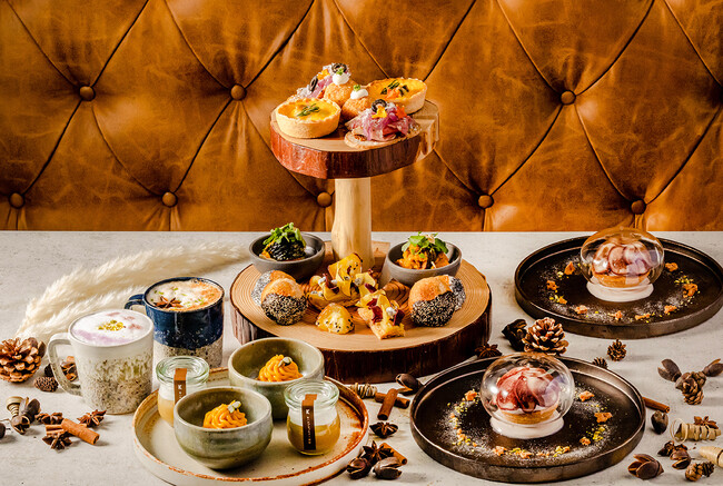 芋、栗、南瓜をふんだんに使った、秋の魅力満載のスイーツ5種、セイボリー5種に、秋のスペシャルドリンク3種を含むフリーソフトドリンクをご用意します。