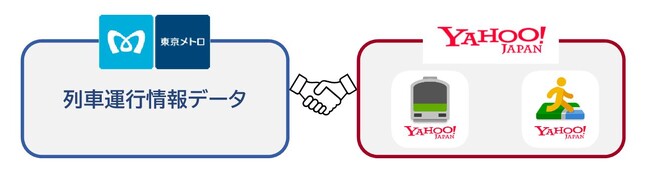 Yahoo! JAPANと連携し、東京メトロが保有する「列車運行情報データ」を、Yahoo! JAPANが提供する乗換検索アプリ「Yahoo!乗換案内」、及び地図アプリ「Yahoo!マップ」に提供し、アプリ上でお客様がご乗車予定の列車の運行状況がリアルタイムで確認できるサービスを提供いたします。