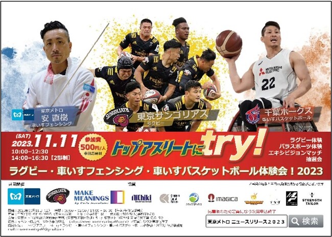 東京地下鉄株式会社(本社:東京都台東区、代表取締役社長:山村 明義、以下「東京メトロ」)とサントリーホールディングス株式会社の公式ラグビーチーム「東京サントリーサンゴリアス」(本社:大阪府大阪市北区、代表取締役社長:新浪 剛史、以下「東京サンゴリアス」)及びMAKE MEANINGS(東京都江東区、代表:村上 慶太)は、共同で「トップアスリートにtry!ラグビー・車いすフェンシング・車いすバスケットボール体験会!2023」を2023年11月11日(土)に開催します。