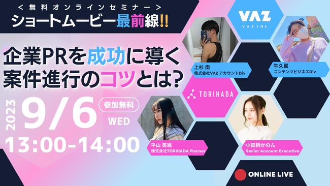 VAZ×TORIHADA共催ウェビナー「ショートムービー最前線!企業PRを成功に導く案件進行のコツとは」を9月6日(水)13時より開催