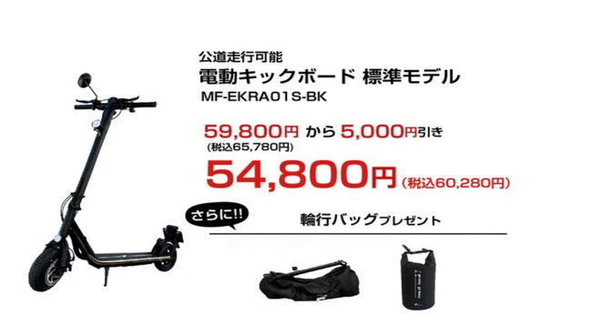 最もスタンダードで運転操作がシンプルな公道対応モデル 電動キックボード MF-EKRA01S-BK 通常価格 65,780円(税込)→特別価格 60,280円(税込)