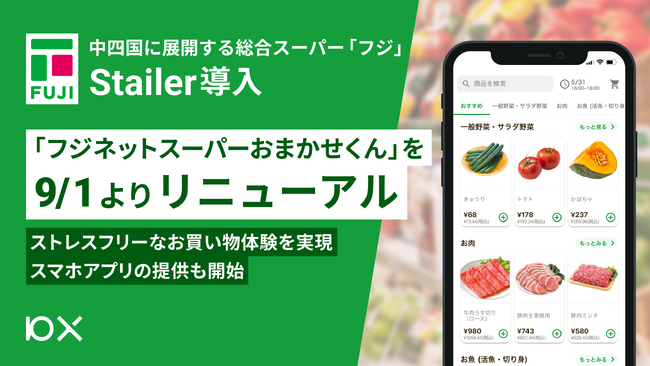 株式会社10X(本社:東京都中央区、代表取締役CEO 矢本 真丈、以下10X)は、愛媛県、高知県、香川県、徳島県、広島県、山口県の6県において103店舗を展開する総合スーパー「フジ・リテイリング」が手掛けるネットスーパー「フジネットスーパーおまかせくん」のリニューアルに伴い、9月1日よりアプリおよびスタッフ向けのオペレーションシステムの提供を開始します。本サービスは、10Xが運営する小売EC向けプラットフォーム「Stailer」を通じて提供します。