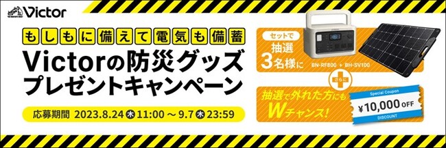 株式会社JVCケンウッドは、公式オンラインストア「JVCケンウッドストア」にて、防災の日にちなんで、「もしもに備えて電気も備蓄 “Victorの防災グッズプレゼントキャンペーン”」(キャンペーン期間:8月24日(木)11:00~9月7日(木)23:59)、および「9月1日は“防災の日” 防災対策キャンペーン」(キャンペーン期間:8月24日(木)11:00~10月15日(日)23:59)を実施中です。