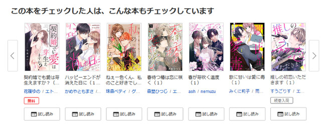 任意の作品の詳細ページを開くと、「この本をチェックした人は、こんな本もチェックしています」のコメントの下に、レコメンド機能が提案する作品の一覧が表示されます。