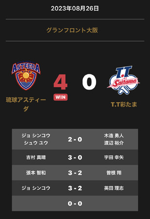 ノジマTリーグ2023-2024シーズン公式戦 8月26日(土)12:00試合開始 琉球アスティーダ vs T.T彩たま 試合結果