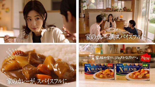 「家のカレーが、スパイスフルに。」というメッセージとともに、スパイス感溢れる「X-BLEND CURRY(クロスブレンドカレー)」が家族の「新しい定番」になる様子を描きます。