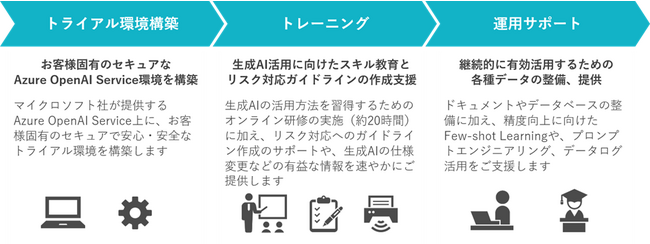「生成AI活用伴走支援サービス」は、マイクロソフト社が提供する Azure OpenAI Service※1を用いた生成AIのトライアル環境構築からスキル教育、実務への活用支援まで、生成AIを安全かつ効果的に利用するための仕組み作りを伴走支援するサービスです。