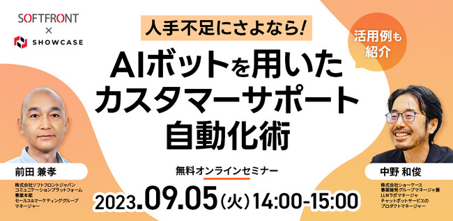 企業と顧客をつなぐDXクラウドサービスを展開する株式会社ショーケース(東京都港区、代表取締役社長:永田豊志、証券コード:3909、以下ショーケース)は、株式会社ソフトフロントジャパン(東京都江東区、代表取締役社長:高須英司、証券コード:2321)と共催で、「人手不足にさよなら! AIボットを用いたカスタマーサポート自動化術」と題した無料オンラインセミナーを9月5日(火)に開催いたします。