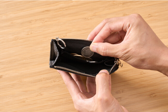 キャッシュレス時代に必要な財布のあり方を追求し、カード・お金・鍵をスマートに収納でき、高級車の内装シートに使われる超高耐久性のエシカルレザーを使用した仕様となっています。